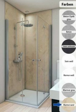 Zur fachgerechten Montage der Duschrückwände benötigen Sie zusätzlich das passende Montage-Set. Weiterhin empfehlen wir die zugehörigen Profile zur Verkleidung der Kanten. Beides finden Sie am Ende dieser Seite verlinkt.