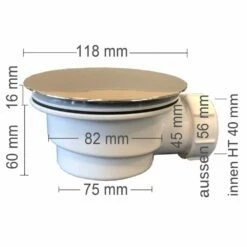 - Ablauf: Tiefe ca. 65 mm, sodass zwischen Boden und Unterkante Ablauf ca. noch 10 – 20 mm Platz ist