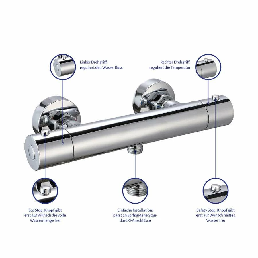 - Schutz vor Verbrühen durch konstante Temperatur selbst bei Druck-/Temperaturschwankungen in der Wasserleitung