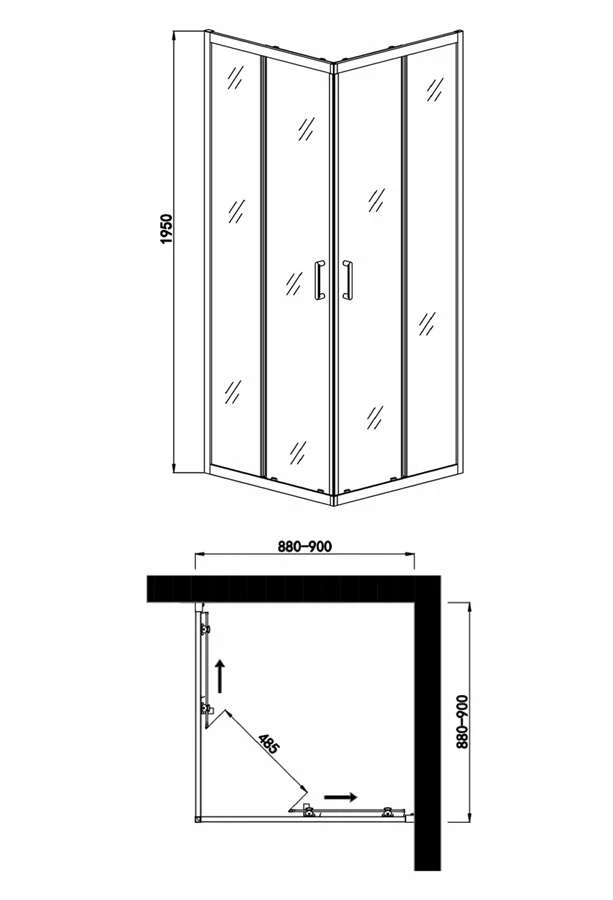 - Abmessungen: 880 – 900 mm x 880 – 900 mm, Höhe: 1950 mm