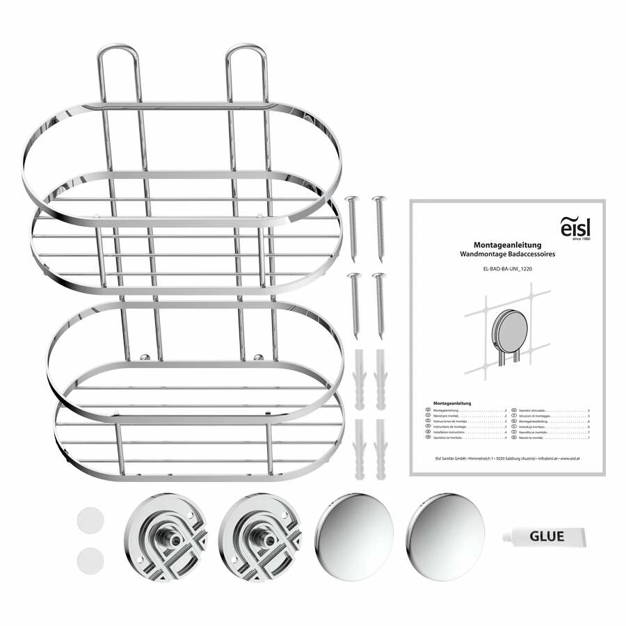 Das Komplett Set enthält 1 x Duschkorb Wand mit 2 Etagen (BxHxT: 220 x 355 x 116 mm), 2 x Wandhalterung mit je einem Klebepad, 1 x Tube Kleber, 4 x Schrauben, 4 x Dübel, Montageanleitung. Die Ablage ist besonders geeignet für Duschen mit einem geringen Platzangebot. Vom Shampoo, Duschgel und Cremes bis hin zum Nassrasierer findet trotzdem alles seinen Platz und ist schnell griffbereit. Und mit seinen 25kg ist es ein echtes Schwergewicht beim Thema Belastbarkeit. Unser Duschkorb ohne Bohren wird ganz einfach mit dem beiliegenden Kleber auf den Fliesen fixiert. Ein zusätzliches Klebepad hält das Wandregal an Ort und Stelle bis der Kleber nach 48 Stunden ausgehärtet ist. Natürlich lässt sich die Klebebfestigung auch wieder demonitieren und der Kleber rückstandsfrei entfernen. Der Aufbewahrungskorb ist aus Edelstahl gefertigt, hochwertig verchromt und korrosionsbeständig. Die Edelstahlstreben auf der Ablage lassen das Wasser schnell ablaufen und verhindern Kalk-und Schmutzablagerungen durch Wasseransammlungen. Die Zwei-Punkt-Befestigung sorgt für Sicherheit und Stabilität. Du möchtest die Duschablage lieber mit Schrauben fixieren? Kein Problem, das Montageset beinhaltet auch Dübel und Schrauben. Je nach Oberflächenbeschaffenheit kannst du wählen: Kleben oder bohren?