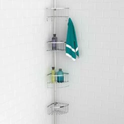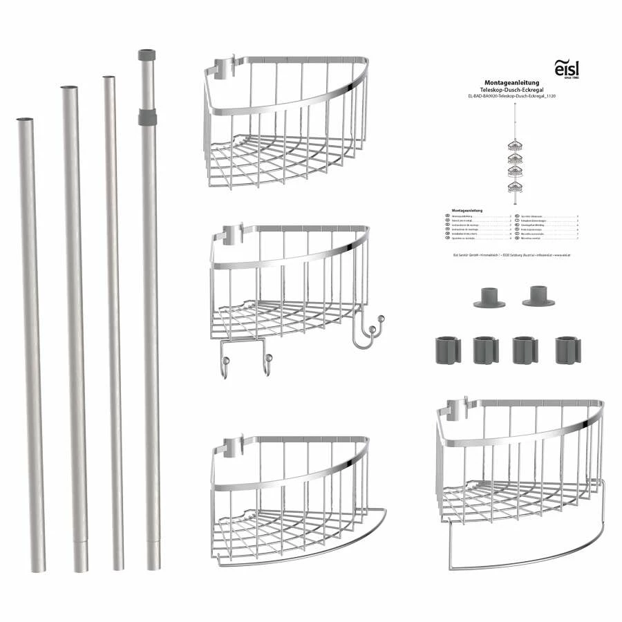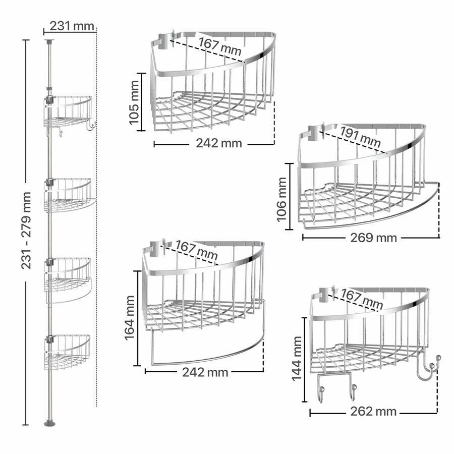 Die hochwertige Edelstahl-Teleskopstange hat eine Mindestlänge von 170 cm und kann bis 276 cm ausgezogen werden. Damit lässt es sich auf nahezu jede Raumhöhe individuell anpassen. Das Duschregal für die Ecke ist ideal für Duschen mit wenig Platz und bietet mit seinen vier Duschkörben trotzdem viel Stauraum für Duschutensilien. Sie sind in der Höhe variabel und lassen sich durch die Clip-Funktion ganz einfach montieren oder abnehmen. Neben Platz für Duschgel, Shampoo und Co verfügen die Körbe über zusätzliche, pfiffige Details wie Haken und Handtuchstange. Sodass auch Nassrasierer, Washballs, Massagebürsten oder Waschlappen schnell griffbereit sind. Hier findet wirklich alles seinen Platz. Die praktische Korb Aufbewahrung lässt das Wasser schnell ablaufen und verhindert Kalk-und Schmutzablagerungen durch Wasseransammlungen auf den Ablagen. Das Duschregal ohne Bohren lässt sich einfach und schnell montieren. Ohne Fachkenntnisse oder handwerkliches Geschick. Einfach praktisch.