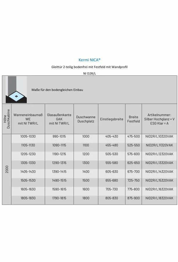 - 2-teilige Gleittür zum Einbau mit einer gleichhohen Nica Seitenwand