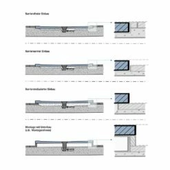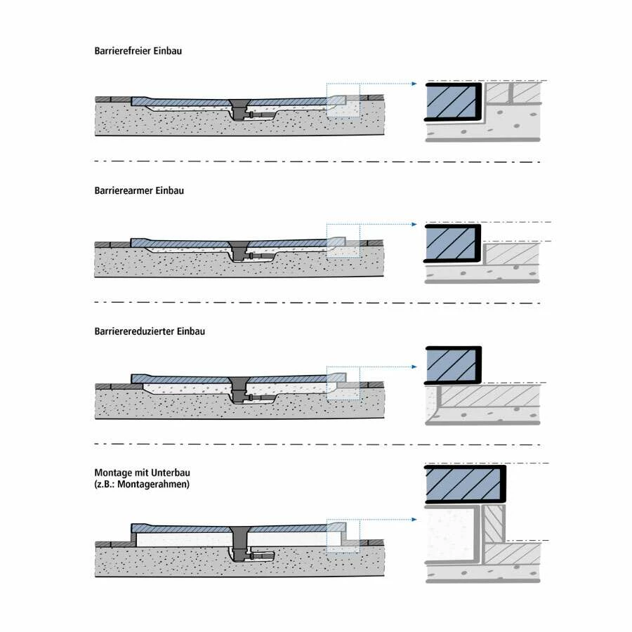 - Installationsmöglichkeiten: bodenbündige Montage, Aufbau auf Estrich oder Bodenbelag, Montage mit Aufstellfüßen