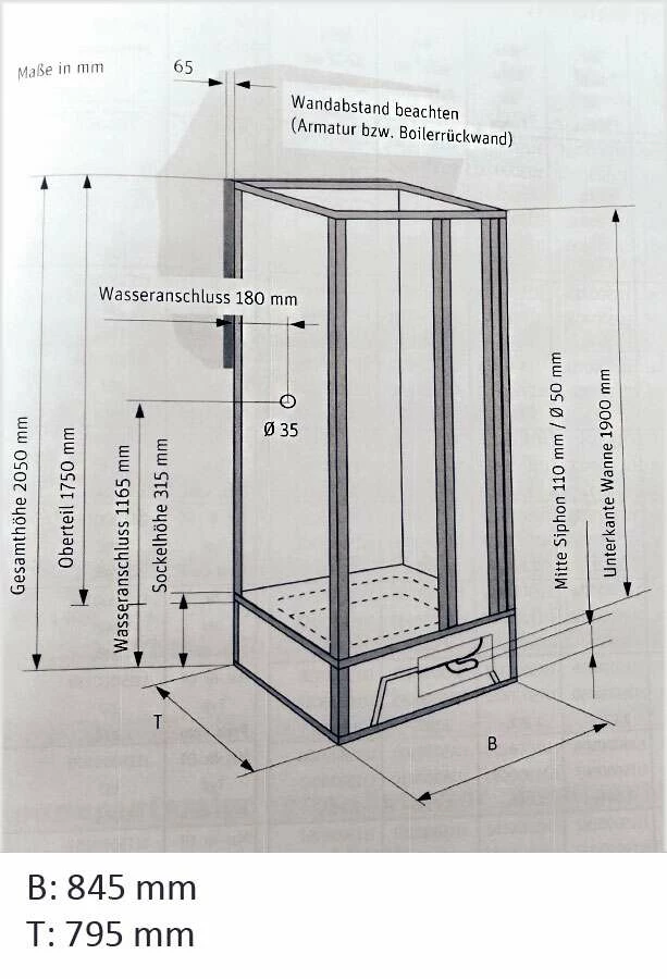 - Breite: 845 mm Außenmaß / 800 mm Wannenmaß