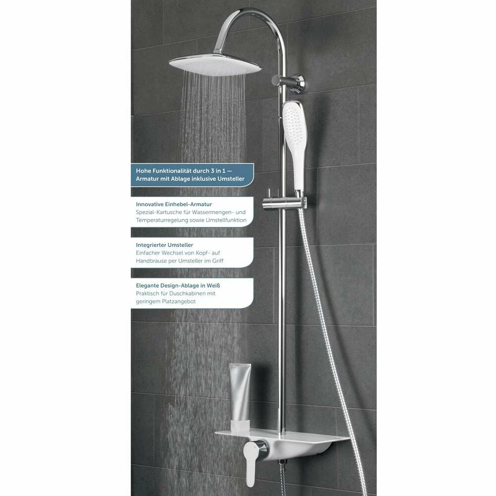 - inkl. Einhebel-Armatur mit integriertem Umsteller im Griff zum Wechseln von Kopf- zu Handbrause