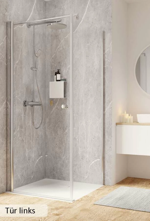 Bitte wählen Sie den gewünschten Türanschlag im Konfigurator in der Größentabelle. Die passende Seitenwand wird jeweils auf der anderen Seite montiert.