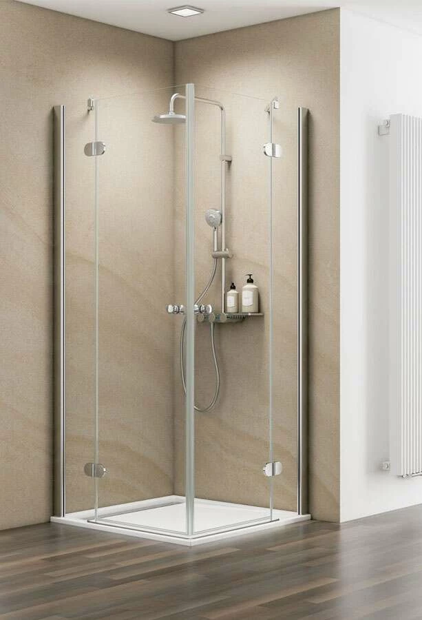 Eine Duschkabine im Standardmaß wird immer kürzer als angegeben gefertigt, z.B. ca. 850 mm statt 900 mm. Fordern Sie Ihren passenden Fliesenspiegel an. Eine reale Umsetzung ist im Sondermaß möglich.